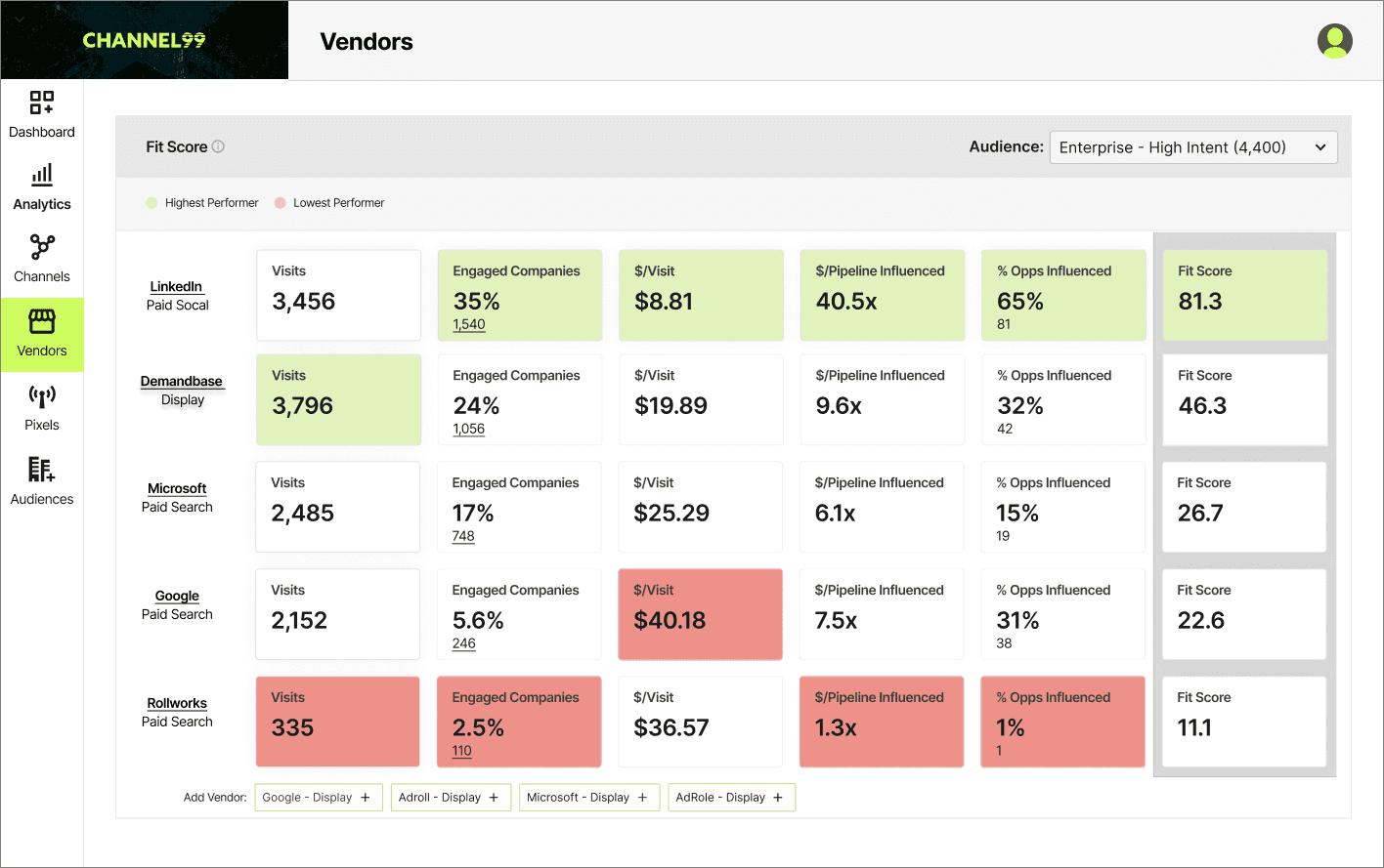 Channel99’s AI has been trained by experts in B2B marketing to help uncover where changes can make a positive ROI impact. Recommendations range from changes to an audience, bidding adjustments or vendor specific modifications.